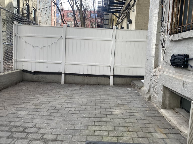 The apartment features an updated kitchen with stainless steel appliances, including a dishwasher and microwave, as well as an in-unit washer and dryer for added ease. High ceilings, hardwood floors, and exposed brick add character, while the private garden provides a peaceful outdoor retreat.