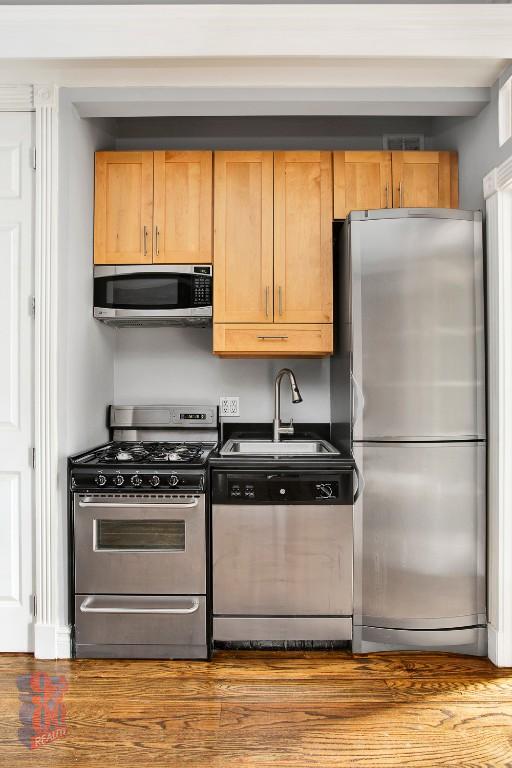 Discover a stunningly renovated 2-bedroom, 2-bathroom apartment at 47 E 1st St #4F available August 1st for $5,995/month with no broker’s fee. The open-concept living and dining area is highlighted by exposed brick walls, high ceilings, and hardwood floors that flow seamlessly throughout the home, creating an inviting loft-like atmosphere. The modern kitchen features stainless-steel appliances—including a gas range, refrigerator, and built-in dishwasher—set against sleek granite countertops and custom white cabinetry, perfect for both everyday cooking and entertaining guests. A private balcony off the living room offers an outdoor retreat in the city. Both full bathrooms have been updated with contemporary fixtures, large mirrors, and clean tile finishes, one with a walk-in shower and the other with a soaking tub, providing spa-like comfort. In-unit washer and dryer hookups add convenience, eliminating trips to communal laundry facilities and keeping the apartment clutter-free. Oversized Thermopane windows ensure energy efficiency and noise reduction, while recessed lighting and individual climate control keep the apartment bright and comfortable year-round. The six-story pre-war building maintains its historic charm with a classic façade, video-intercom entry, and a live-in superintendent who handles maintenance requests promptly.